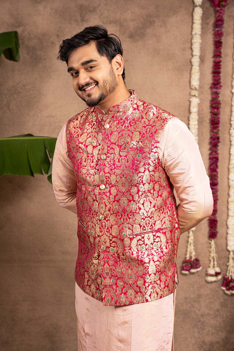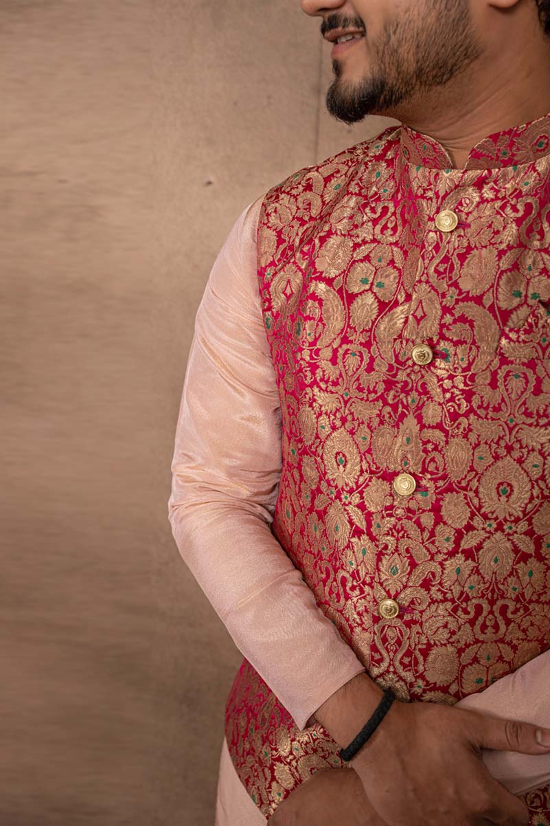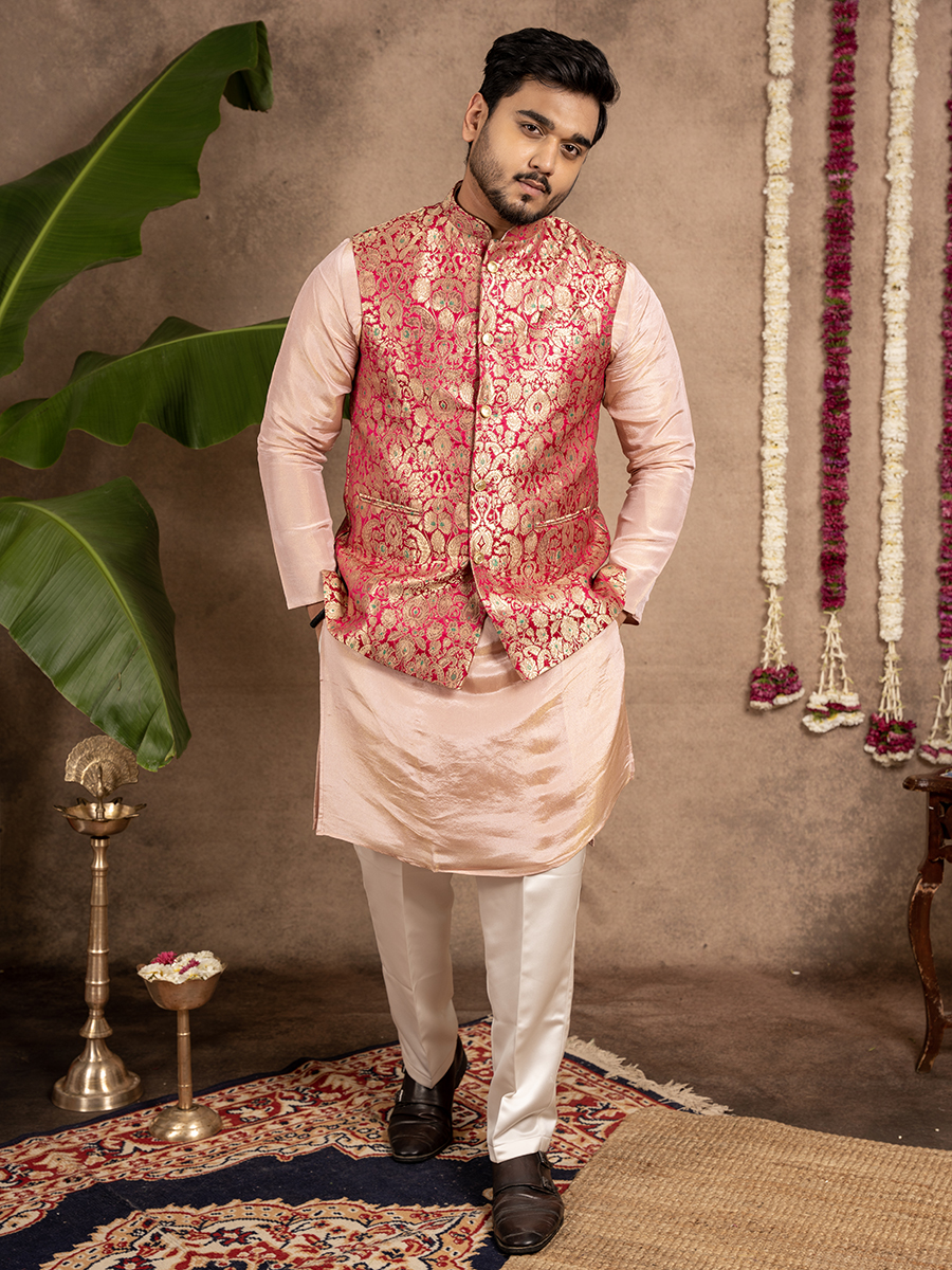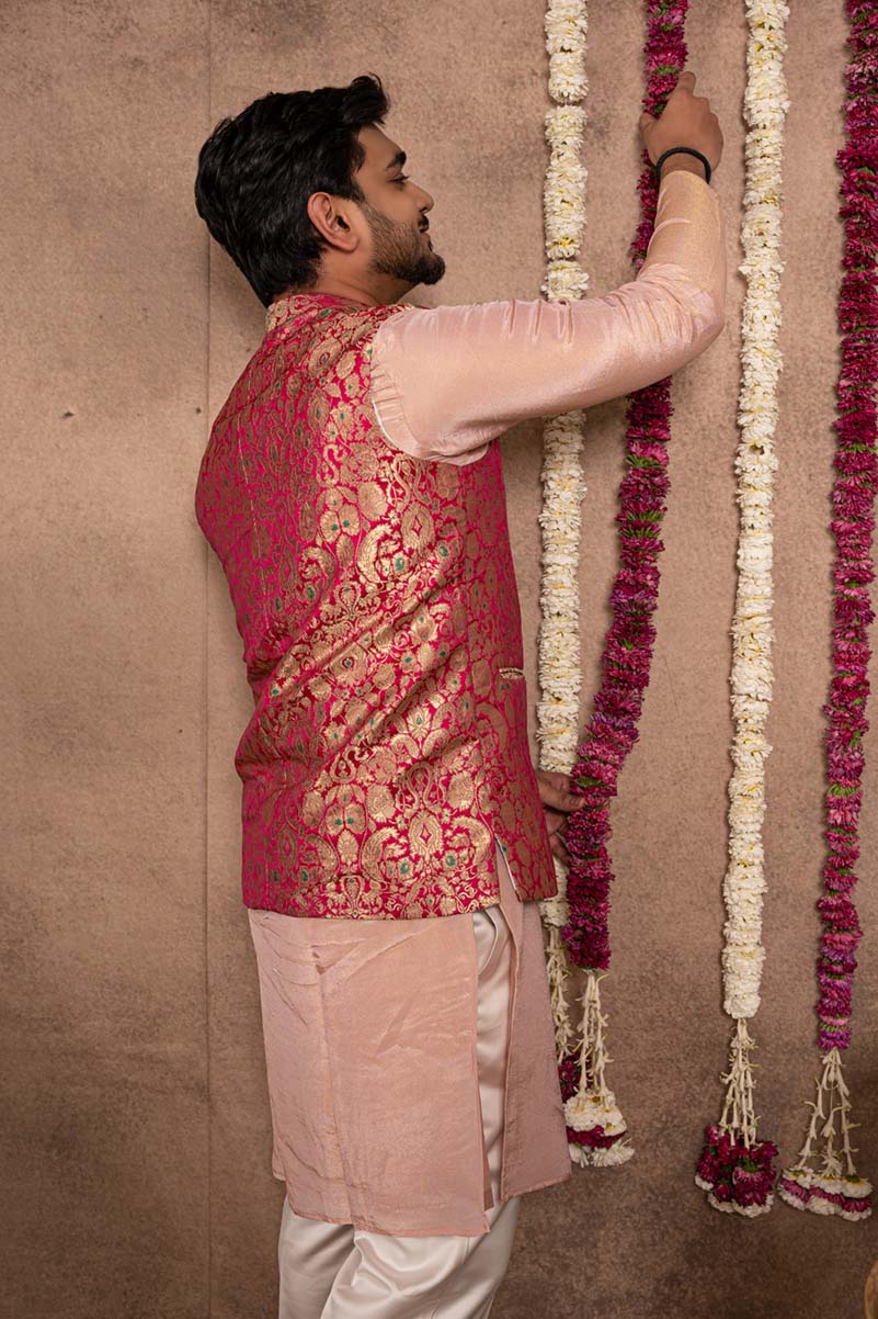 Karna – An epitome of Loyalty. Here’s is an elegantly crafted koti, kurta set paired with matching pants, perfect for completing the groom’s majestic look!